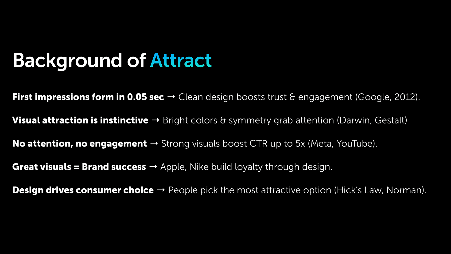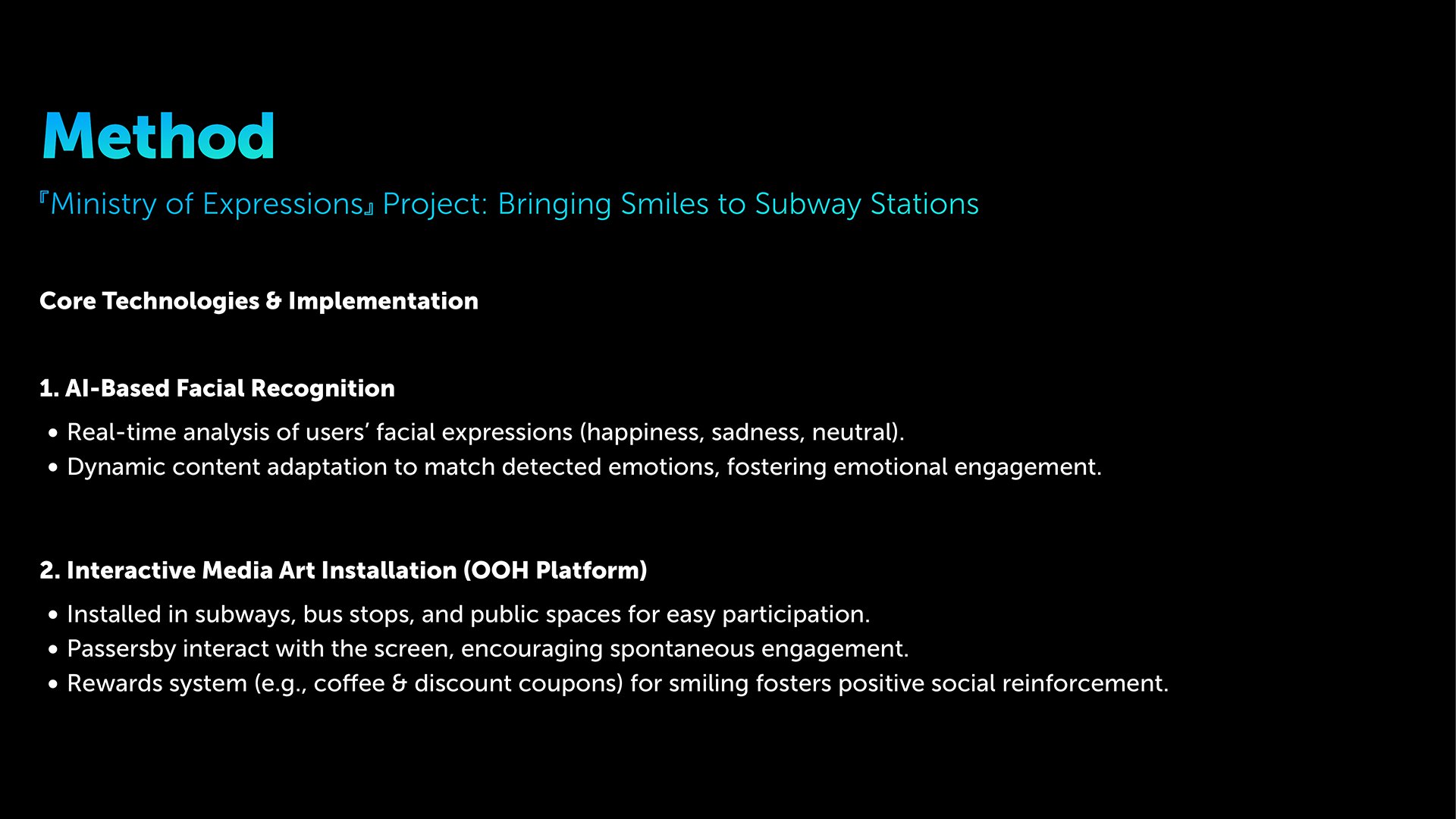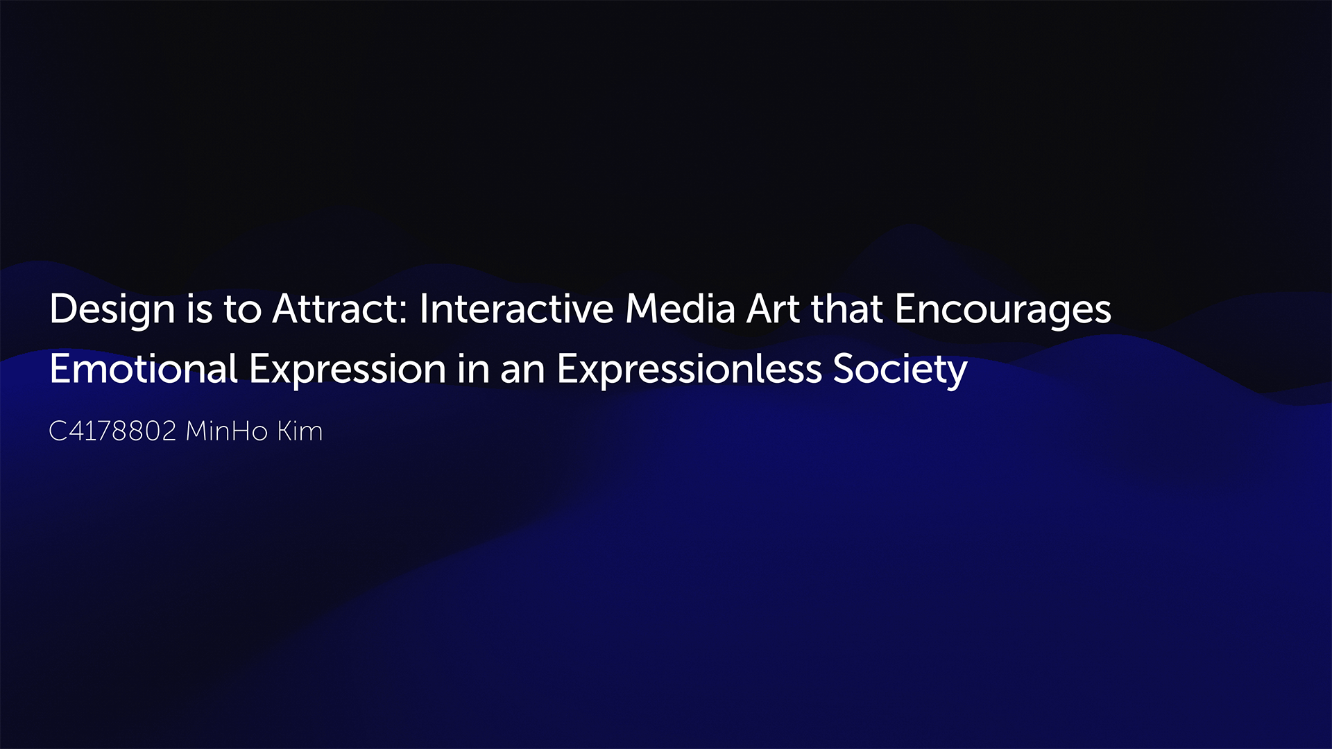 『Design is to Attract: Interactive Media Art that Encourages Emotional Expression in an Expressionless Society』 is an interactive media art project aimed at addressing the emotional suppression prevalent in Korean society. Through a study of 507 participants, the research confirmed that individuals who express their emotions less tend to exhibit higher levels of depression and anxiety. Conventional approaches such as emotional education, counseling, and public campaigns have proven to be temporary and often feel forced, failing to inspire lasting behavioral change. In response, the proposed project, 『Ministry of Expressions』, introduces a public installation that combines real-time facial recognition AI with a reward system to naturally encourage emotional expression. When a user remains expressionless, the system plays humorous animations to elicit a smile; once a smile is detected, digital rewards such as coupons are provided, promoting emotional recovery and social connection. Grounded in adaptation theory, social proof theory, flow theory, and UX response theory, this project employs a mixed-method approach—combining quantitative data (e.g., smile frequency, app usage) and qualitative insights (e.g., interviews, personal experiences). It represents a new attempt to socially restore emotional expression through the integration of technology, design, and public engagement.