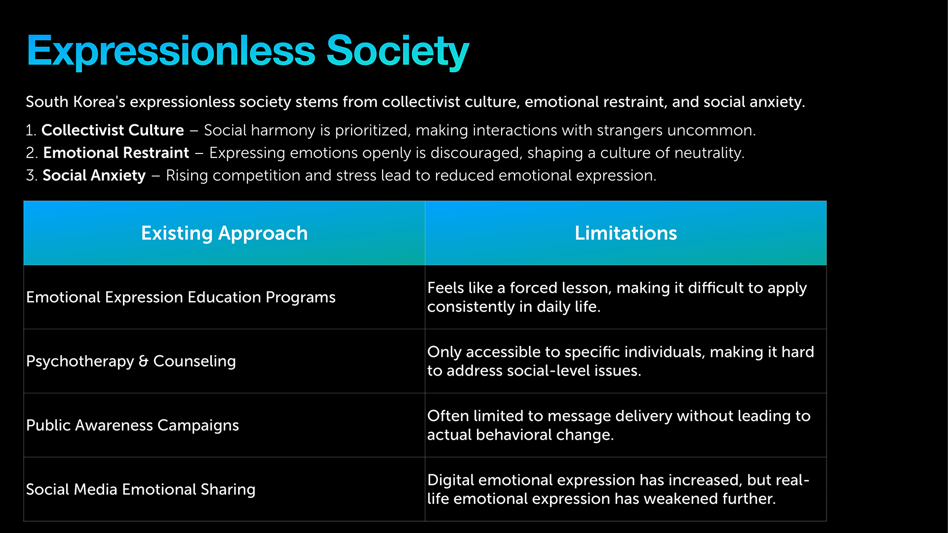 『Design is to Attract: Interactive Media Art that Encourages Emotional Expression in an Expressionless Society』는 감정 표현이 억제된 한국 사회의 정서적 문제를 해결하기 위한 인터랙티브 미디어 아트 프로젝트다. 연구자는 507명을 대상으로 한 분석을 통해, 감정 표현이 부족할수록 우울과 불안 수준이 높다는 사실을 확인했다. 기존의 감정 교육이나 캠페인은 강요되고 일회적이라는 한계를 갖는다. 이에 따라 제안된 『표정청: Ministry of Expressions』은 실시간 표정 인식 AI와 보상 시스템을 결합하여, 사용자가 자연스럽게 웃도록 유도하는 공공 설치물이다. 무표정일 경우 웃음을 유도하는 콘텐츠를, 웃었을 때는 디지털 보상을 제공함으로써 정서 회복과 사회적 연결을 이끌어낸다. 이 프로젝트는 적응 이론, 사회적 증거 이론, 몰입 이론, UX 반응 이론을 기반으로 하며, 정량(웃음 빈도, 앱 사용 데이터)과 정성(인터뷰, 경험 서술) 평가를 병행하는 혼합 연구 방법을 채택한다. 기술과 디자인을 통해 감정 표현을 사회적으로 회복시키고자 하는 새로운 시도다.