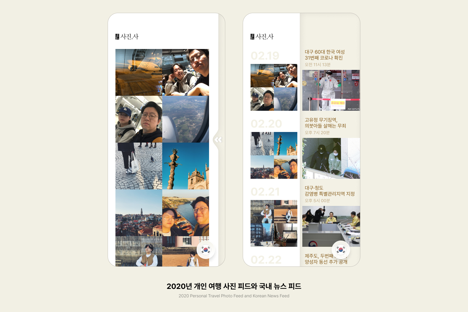 우리는 매일 수많은 사진을 찍지만, 그중 대부분은 스마트폰 앨범 깊숙이 잊히고 맙니다. '사진.사'는 단순히 기록을 보관하는 기술을 넘어, 개인의 소중한 순간에 사회적 맥락을 연결하는 새로운 디자인 경험을 제안합니다. 앙리 카르티에 브레송의 '결정적 순간'을 현대적으로 재해석한 이 서비스는, 당신의 일상 사진과 그날의 주요 보도사진을 나란히 배치합니다. 이를 통해 개인의 추억은 세상에 대한 공감으로 확장되고, 잊혔던 사진들은 '제3의 결정적 순간'으로 다시 태어납니다. 단순한 보관을 넘어 소통과 공감의 장으로. '사진.사'와 함께 당신의 기록을 더 넓은 세상으로 연결해 보세요.