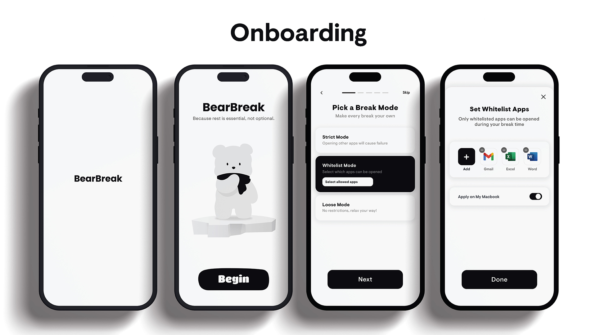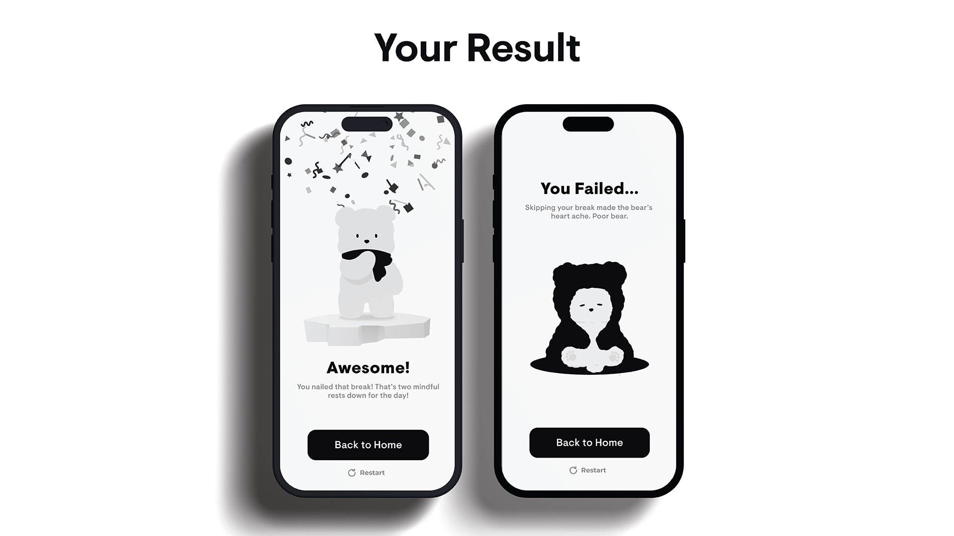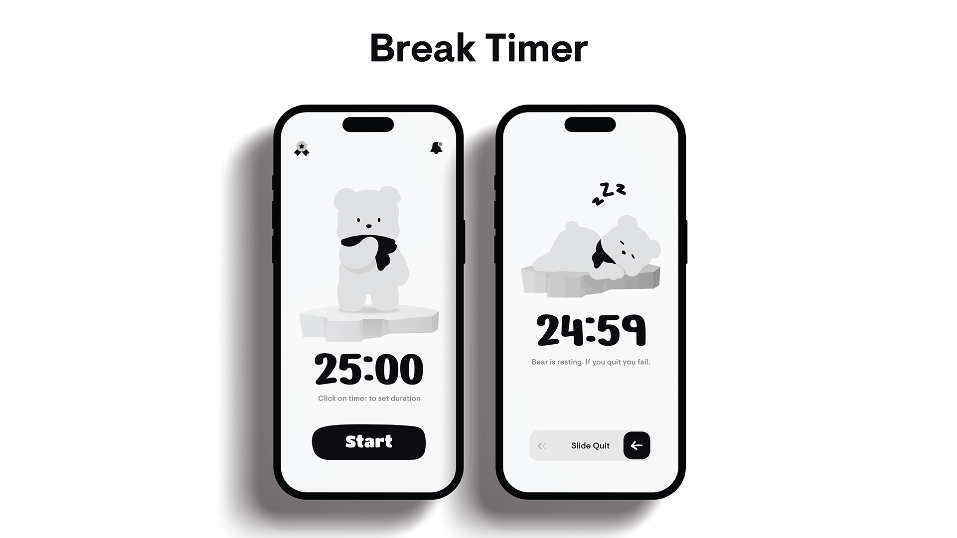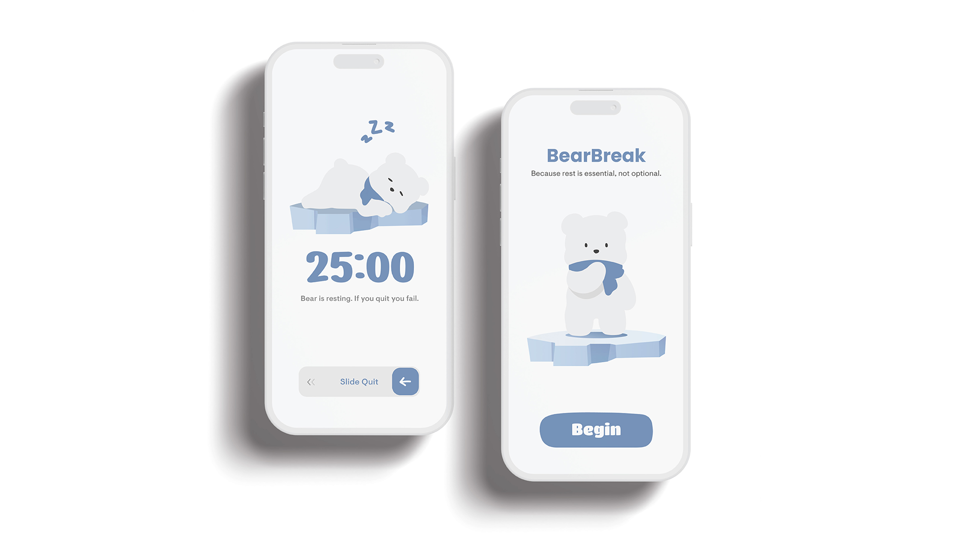 In a world that glorifies hardworking and productivity, rest is often overlooked or even guilt-inducing. Many people would power through work without taking proper breaks, leading to burnout and exhaustion. Most productivity tools focus on getting more done, but few emphasize the importance of truly resting. This is how the idea of BearBreak was created—a Pomodoro app that shifts the focus from work to rest. Inspired by the way bears embrace deep rest through hibernation, this app is a reminder that breaks are not a waste of time—they’re essential for our well-being and for a long-term productivity.