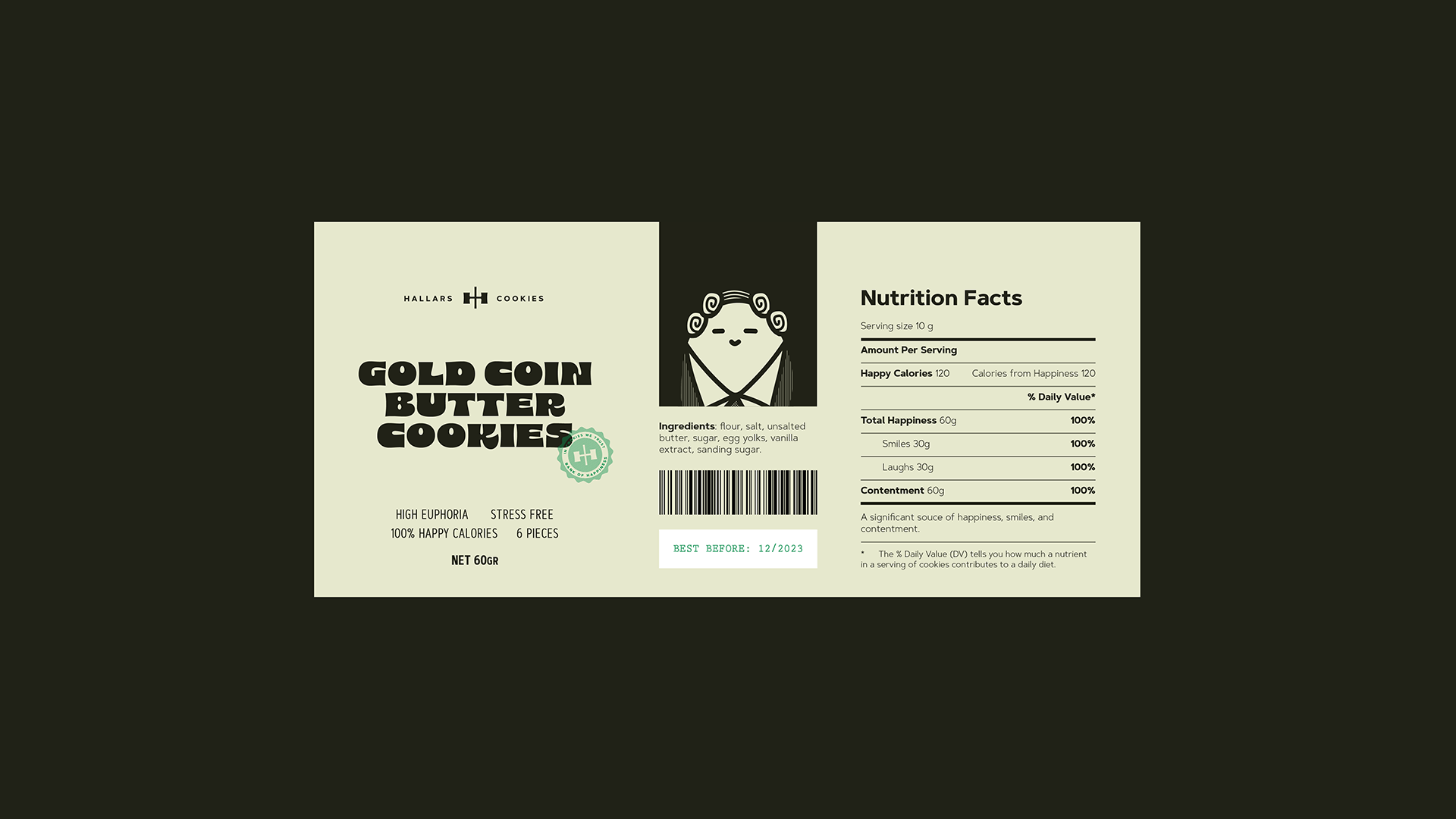 Hallars Cookies is a butter cookies brand. Shaped as gold coins and packed in a dollar bill box, its concept is having cookies as an emotional investment, as we all know, cookies bring happiness.