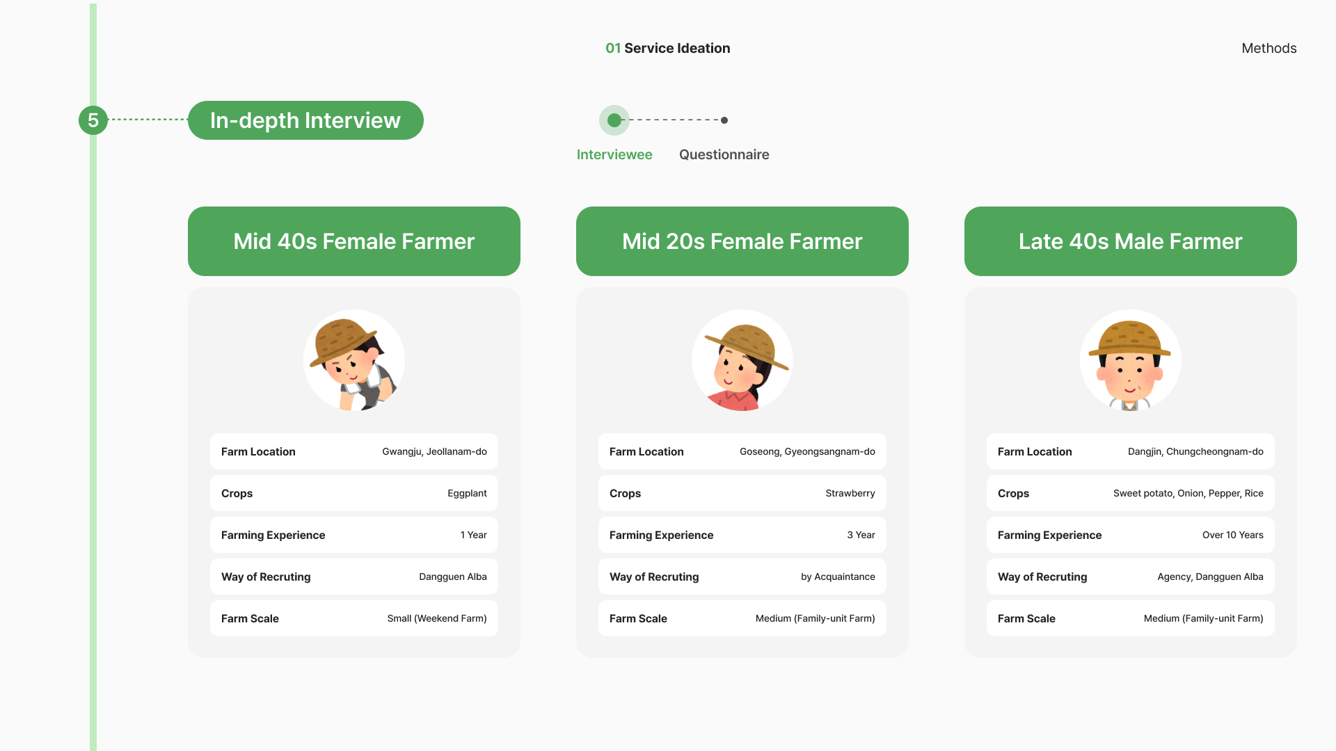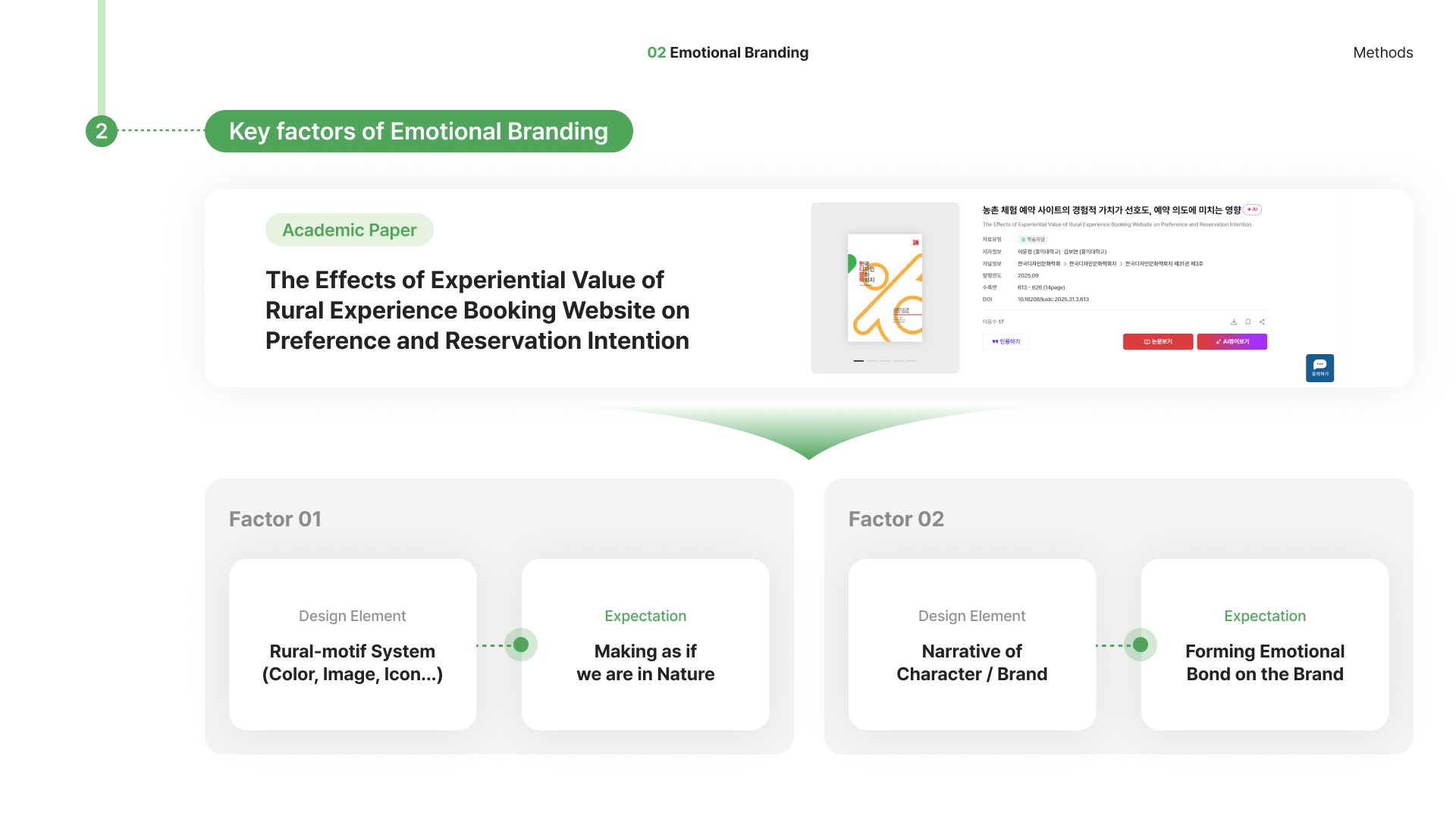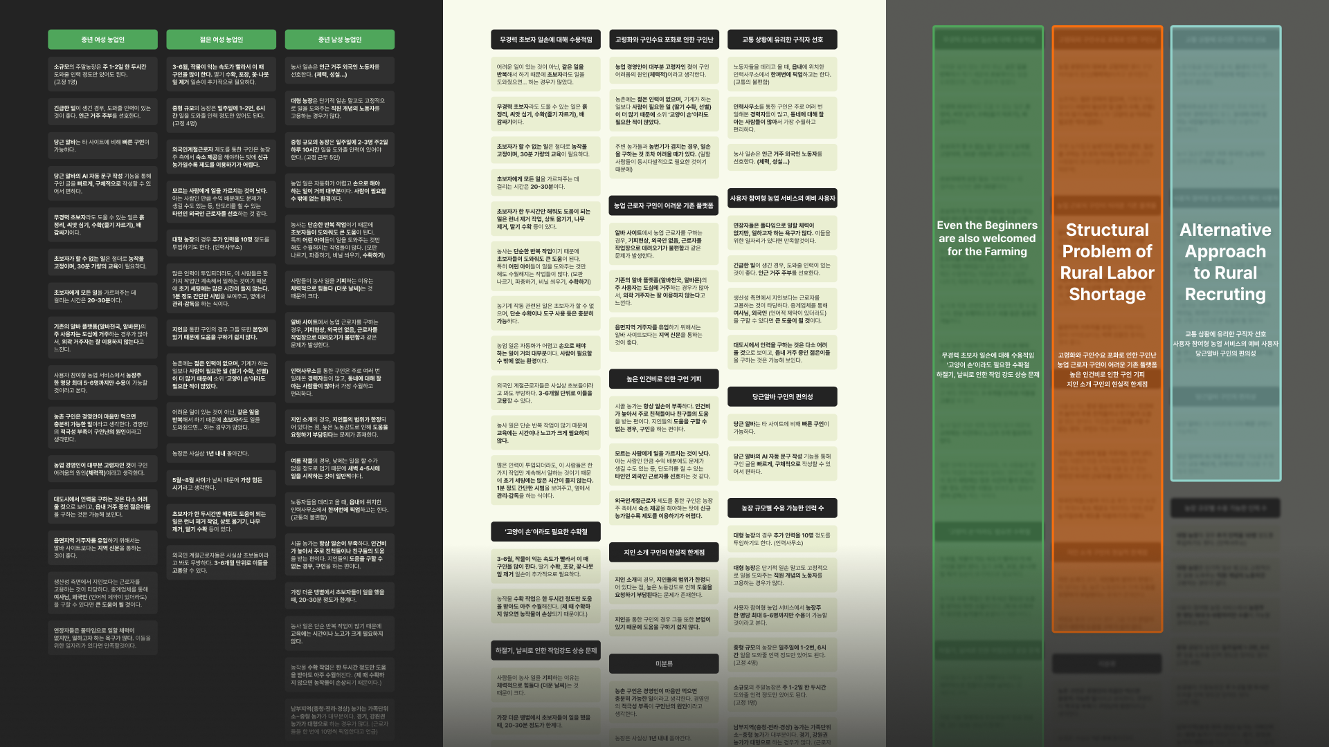 '오손'은 농촌 일손 부족 문제를 다루며 농업에 대한 심리적 거리감 완화를 목표로 합니다. 사용자들은 일정시간 농작업에 참여하여 수확물 일부를 보상으로 가져가는 '품앗이'를 경험할 수 있으며, 사용자와의 감성적 관계 형성 및 심리적 저항감 감소를 위해 농촌 모티프 감성 브랜딩 디자인을 사용했습니다.